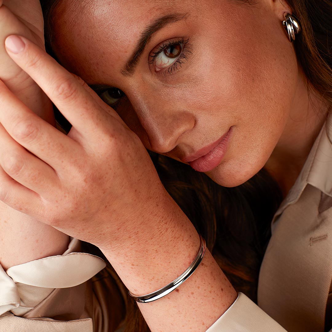 Blending both elements of a chain bracelet and a bangle, this piece stands out through its unique blend of movement and calm. While looking like a classic bangle, the chain element is designed for comfort and it’s sizing is universal for ultimate adjustability.